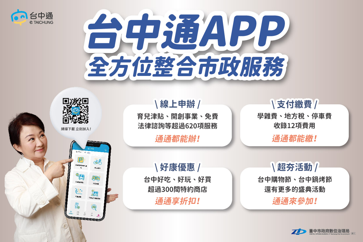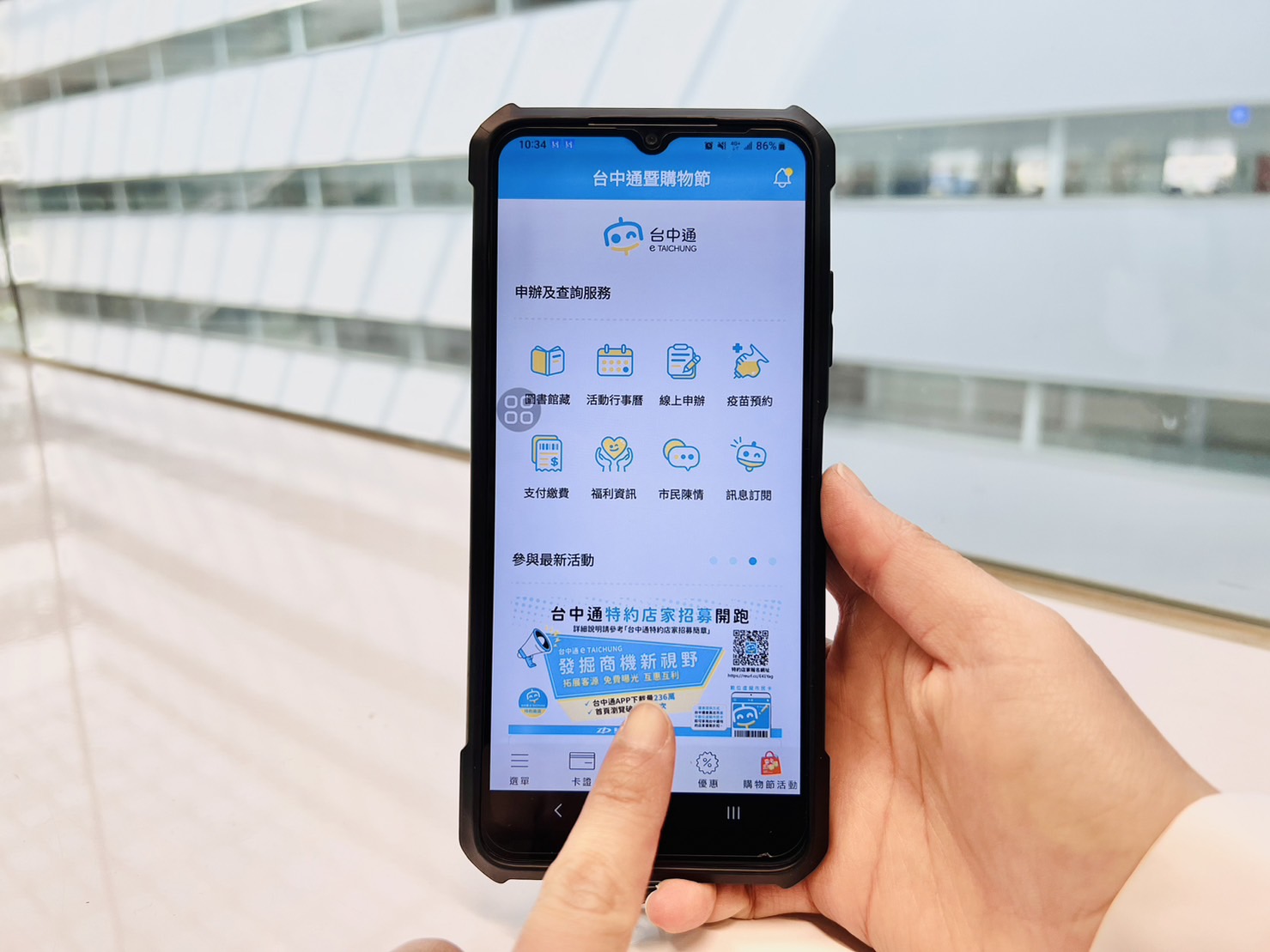 數位局補充說明,台中市政府致力推動智慧城市,為落實數位治理,在原「台中購物節APP」基礎上,數位局整合跨局處線上服務,建構台中通數位市民平台,涵蓋服務e櫃台、支付繳費通、陳情整合平台、疫苗預約等線上服務,同時具有數位市民卡的功能,針對會員可享有特約店家好康優惠,透過一個APP還能參與「台中購物節」、「台中鍋烤節」、「耶誕嘉年華」等台中大型活動,讓市民一機在手就能享有便利生活,打造幸福宜居的「台中城市品牌」。(3/13*7)*數位治理局