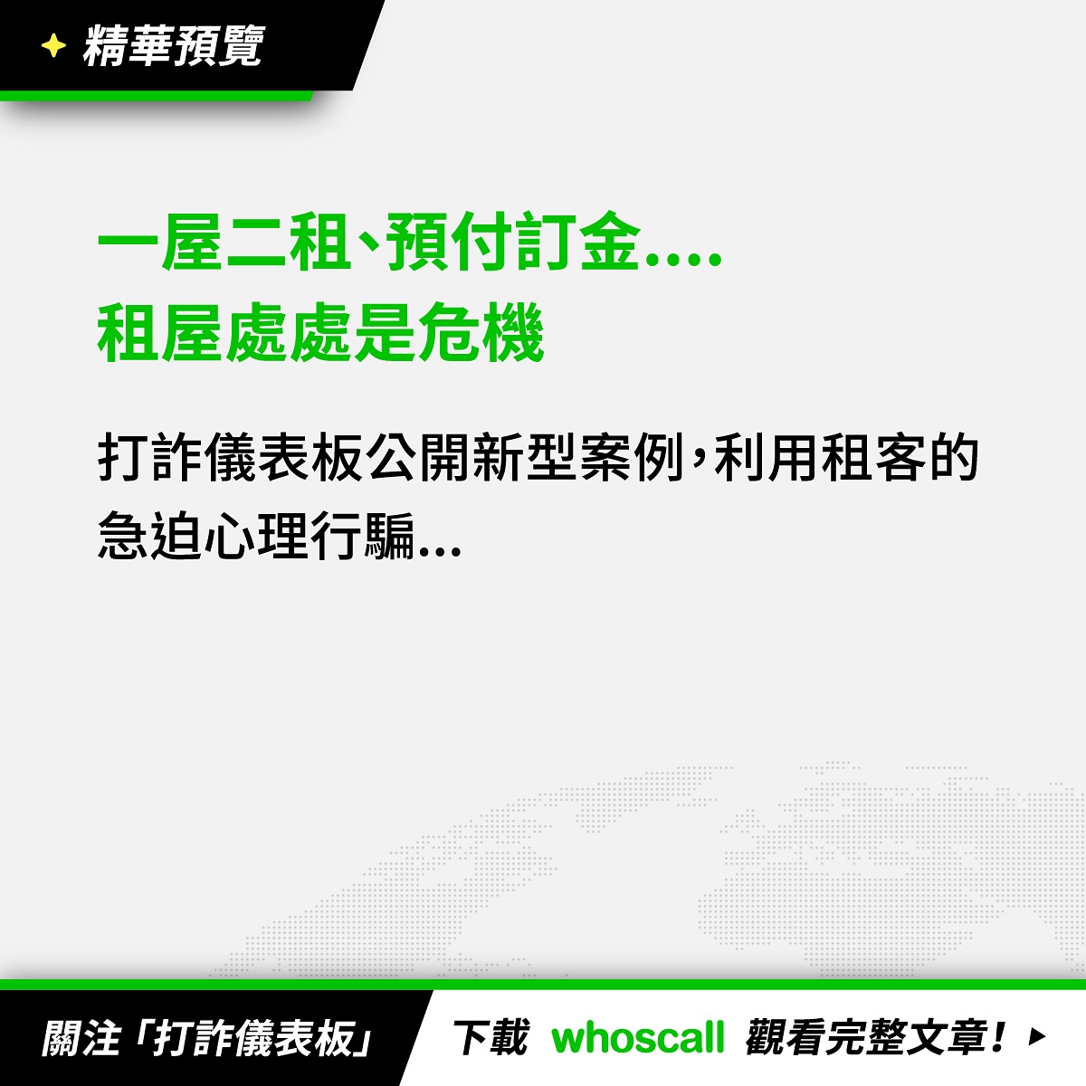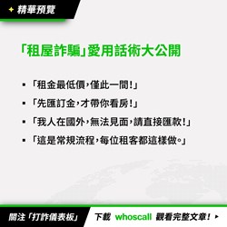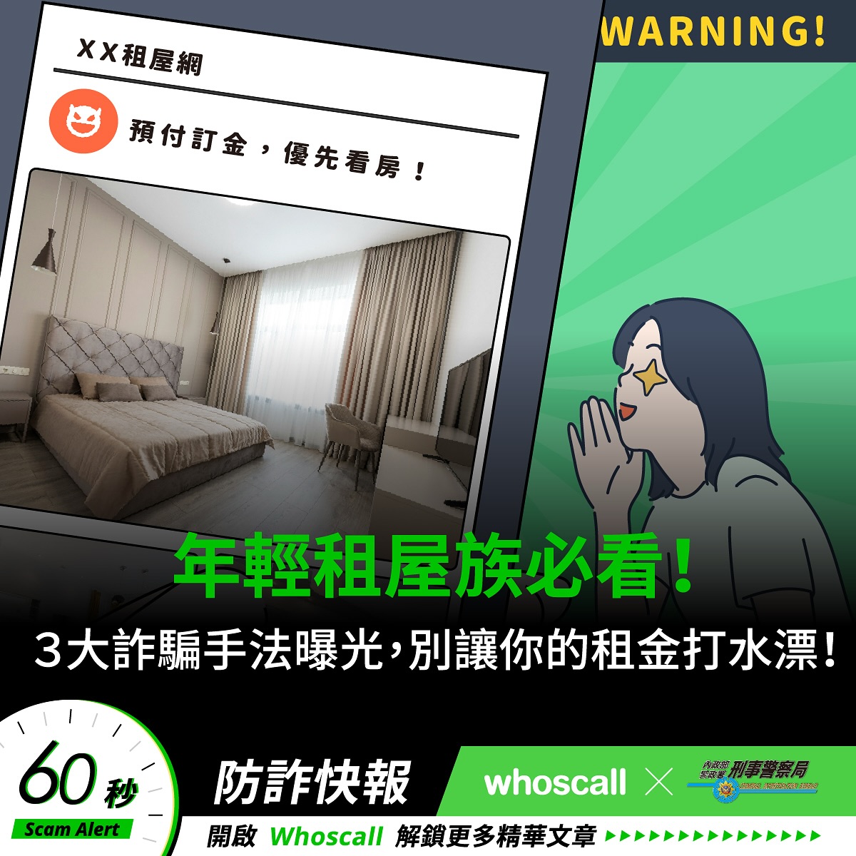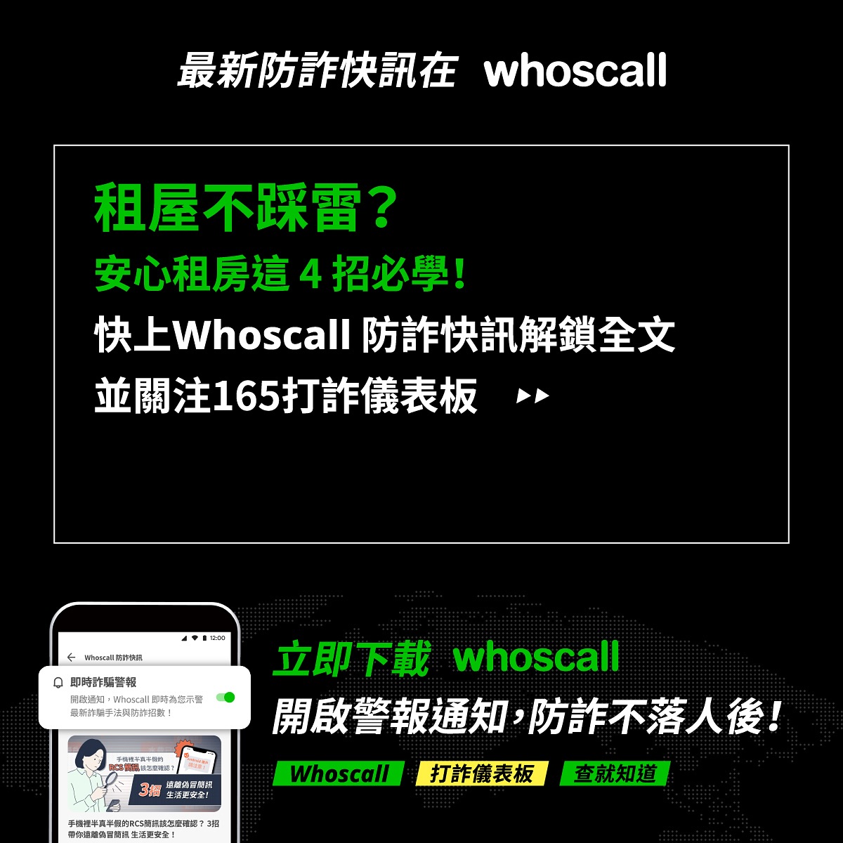 詐騙集團透過 LINE 私訊、假房東、假租屋平台 等手法,鎖定首次租屋與外地工作族群。刑事局聯手 Whoscall 提醒大家,租屋前要比價,更要避詐陷阱!