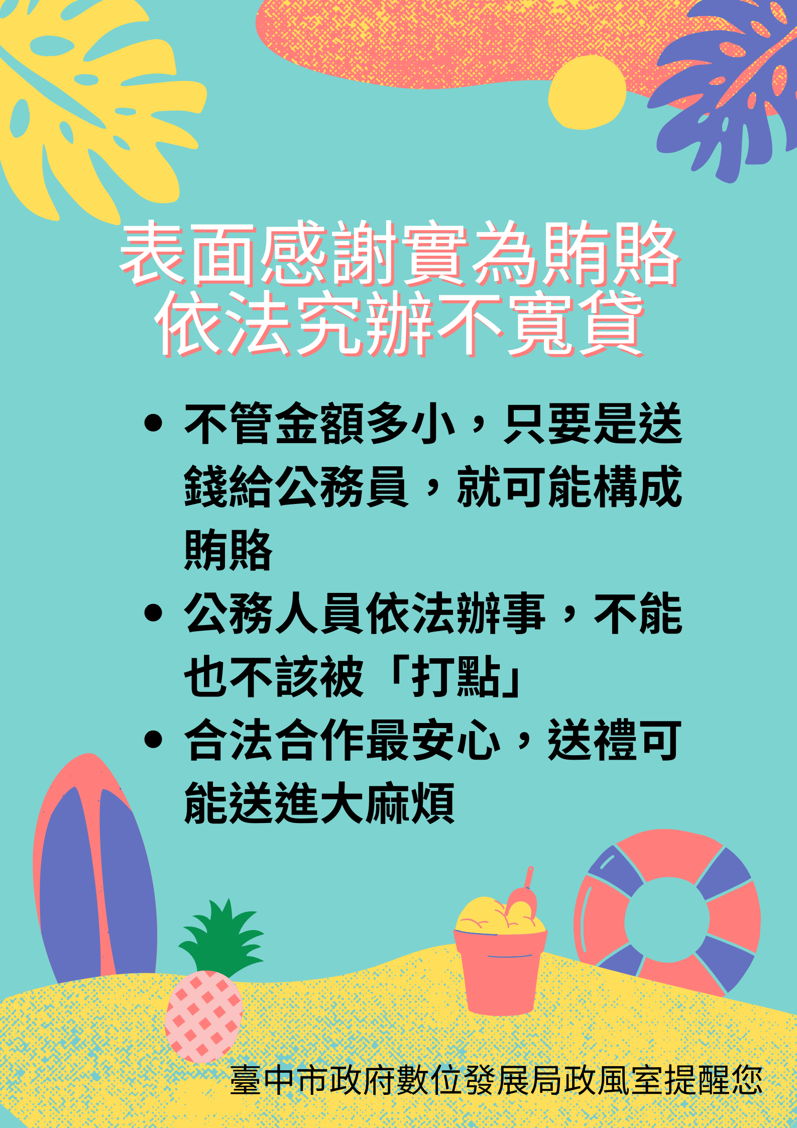 提醒同仁:日常工作中,務必謹守廉潔底線,避免因一時收受「心意」,換來刑責與名譽損失。