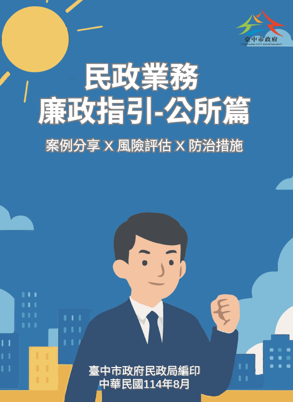 民政業務為市政推展第一線,因事務繁雜且人員更迭頻繁,本府民政局特編撰「民政業務廉政指引-公所篇」電子手冊,蒐集具代表性案例,並依五大類別解析潛在風險與防治措施,提供同仁明確準則,以利業務傳承並落實廉能治理。