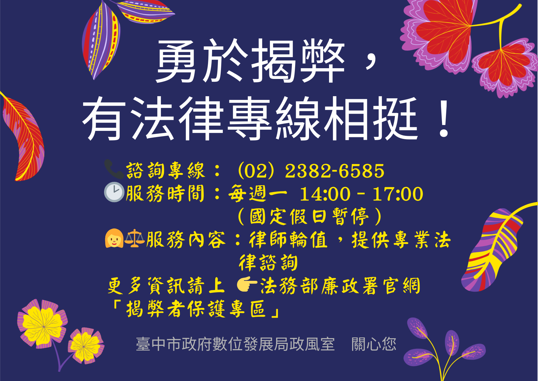為保障揭弊者權益,法務部廉政署提供法律諮詢服務,相關資訊如下: