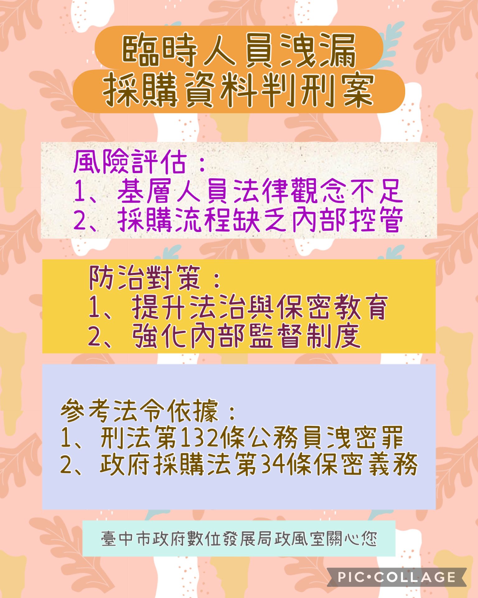 某政府機關在辦理公共設施採購案時,兩名臨時人員私自將招標內容提前傳給廠商,利用通訊軟體洩漏尚未公開的規格資料。