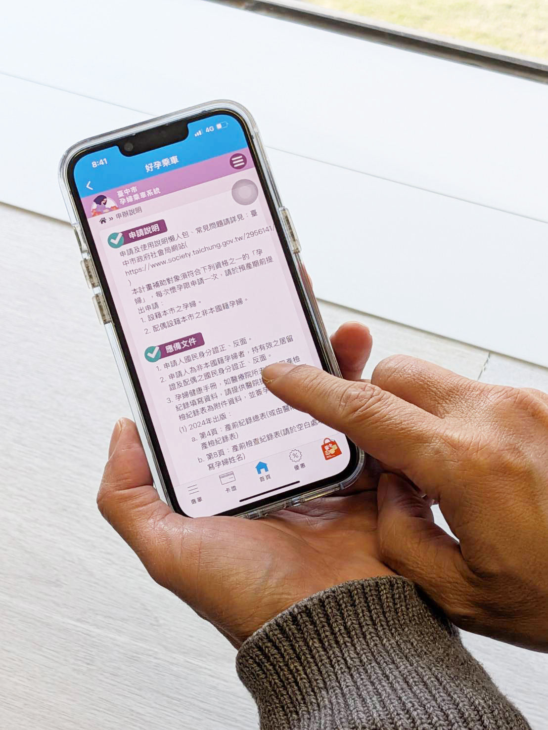 數發局分享,家住霧峰區的卓小姐與丈夫皆為雙薪家庭,新手爸媽在懷孕期間需頻繁往返醫院進行產檢與回診,交通安排常成為生活中的一大挑戰。自從使用「好孕乘車」服務後,只要透過《台中通》APP即可快速叫車並折抵車資,不僅節省時間,也讓外出就醫更安心。卓小姐笑說,少了為交通奔波與接送協調的煩惱,夫妻能把更多心力放在彼此照顧與迎接新生命上。