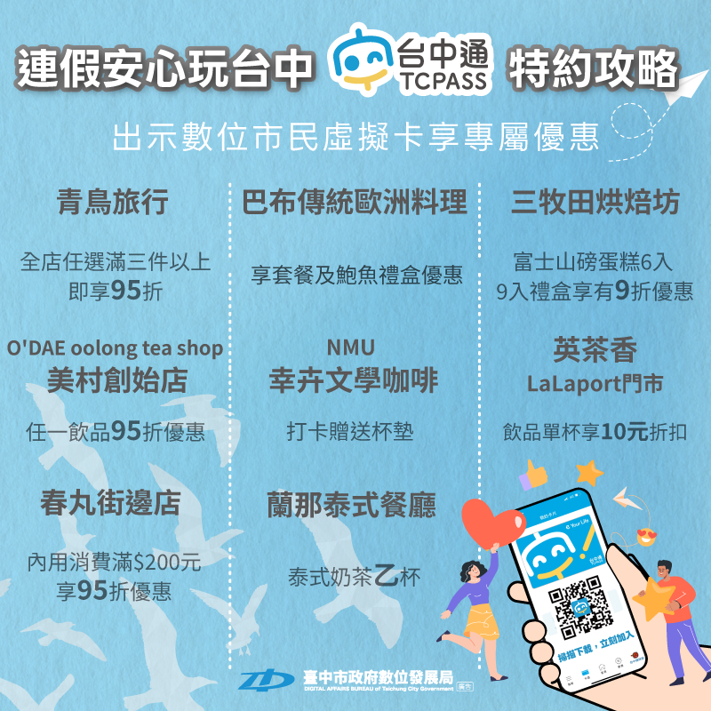 228連假即將到來,同時中台灣燈會「幸福蜜馬 台中MOOMIN ON!」展期已進入倒數最後一週!台中市政府數位發展局邀請全國民眾把握假期,來場台中城市輕旅行。為了讓民眾玩得盡興又省錢,數位局推薦出遊前先下載《台中通 TCPASS》APP,憑數位市民虛擬卡即可在超過1600家特約店家享有專屬優惠,從人氣伴手禮到在地美食應有盡有,讓連假行程更加精彩豐富。