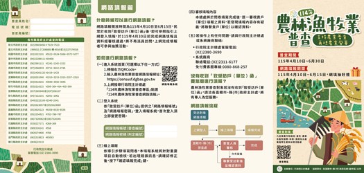 普查對象為經營農作物栽培、畜牧、農事及畜牧服務、林業、漁撈及水產養殖等生產與休閒活動之業者;普查期間自115年4月10日至6月30日,網路填報期間自115年4月10日至6月15日,凡完成網路填報,皆可參加行政院主計總處規劃之抽獎活動,最大獎10萬元商品卡1名,另有5萬元2名、2萬元12名等獎項,合計約351個獎額,若於4月10至4月30日完成,中獎機率可再提高。